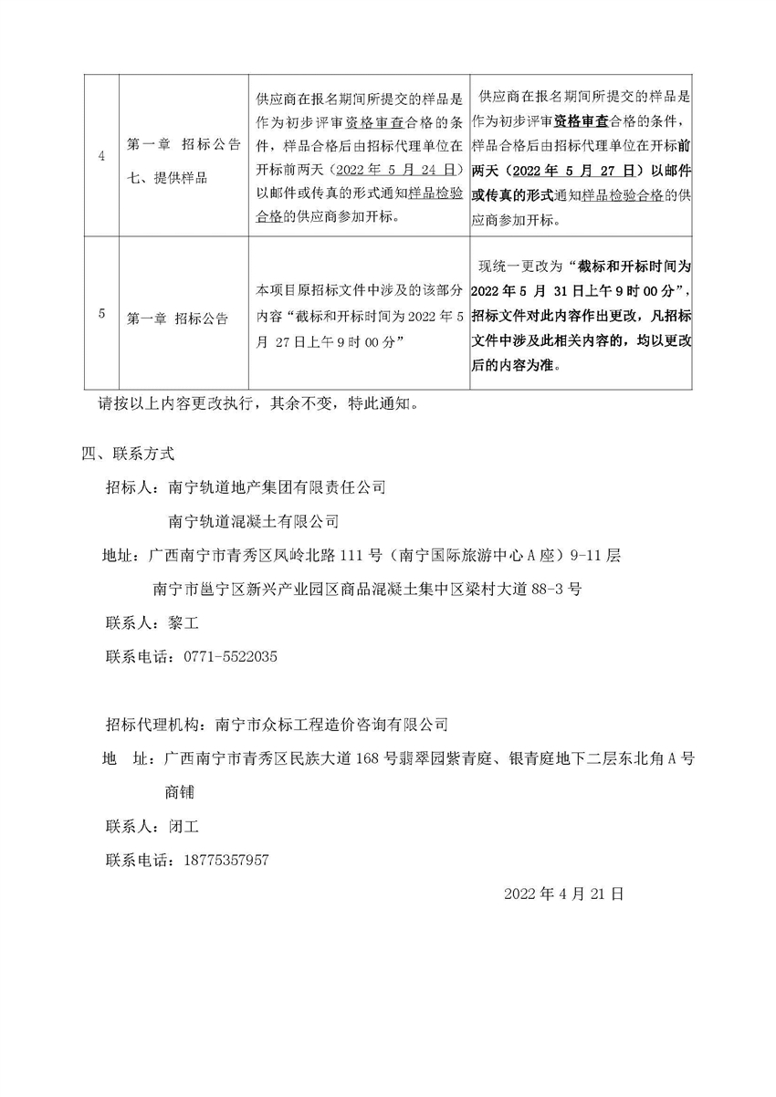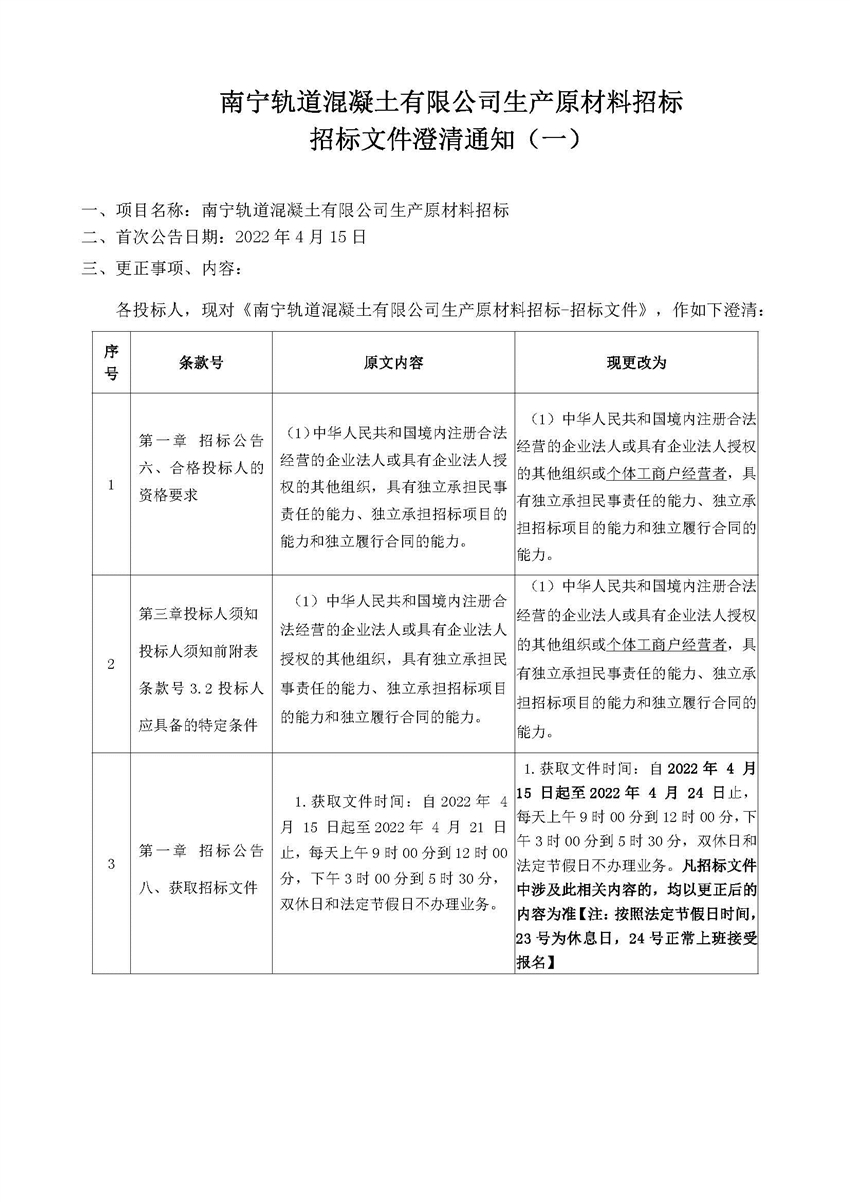 南寧軌道混凝土有限公司生產(chǎn)原材料招標(biāo)招標(biāo)文件澄清通知(一)